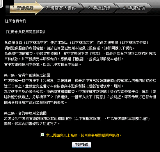 (1) 閱讀條款 (2) 填寫基本資料 (3) 手機認證 (4) 申請成功